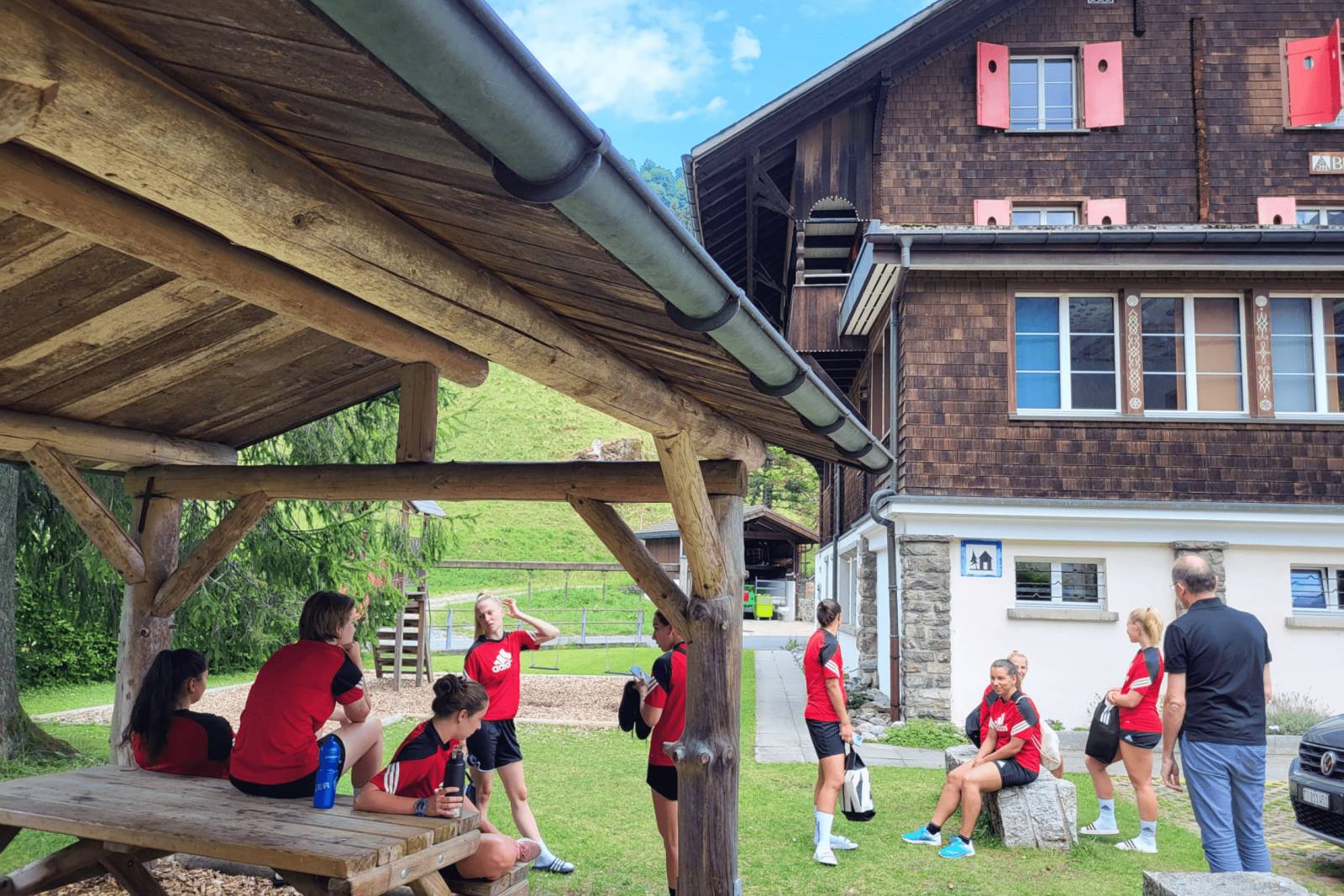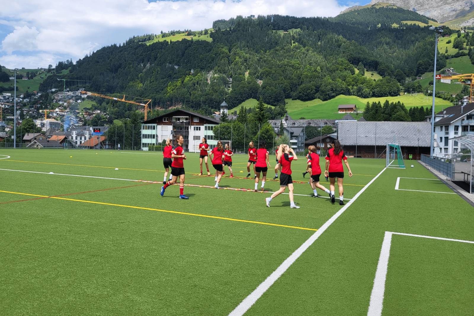 Pünktlich um 12.30 Uhr kommen die 17 Spielerinnern und die zwei Trainerinnen der FFV Basel an. Nach einer kurzen Begrüssung gehen die Mädchen auf ihre Zimmer, und ziehen sich für das um 13.30 Uhr angesetzte Training um. Nach ein paar Minuten machen sich die Spielerinnen auf den Weg zum Fussballplatz, damit sie sich vor dem Training noch ein wenig aufwärmen können. Währenddessen fahren ich und die Trainerinnen mit dem Auto, damit ich genug Zeit habe, ihnen die gesamte Ausrüstung zu zeigen, bevor das Training beginnt. Dort wird auch der Torwarttrainer sein, der sich entschieden hat, woanders zu schlafen. Wahrscheinlich um ein bisschen mehr Ruhe und Frieden zu haben. Pünktlich um 13.30 Uhr beginnt das Training, das bis 15 Uhr dauern wird. Die Sonne scheint und die Aussicht ist atemberaubend. Nach dem Training gehen die Mädchen zurück in die Jugendherberge, um zu duschen und sich zu entspannen. Die Kleidung, die sie für das Training benutzt haben, werden gewaschen, damit sie am nächsten Tag sauber sind; ich koordiniere den Wäscheservice mit dem Personal der Jugendherberge, das sehr freundlich und hilfsbereit ist.