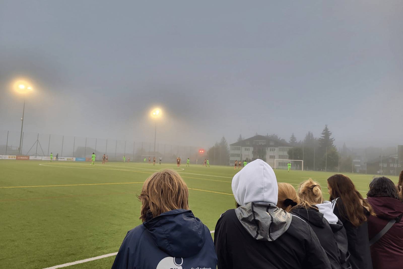 In der Zwischenzeit ist in Engelberg der Nebel angekommen und die Temperaturen sind gesunken. Aber kein Problem, denn die Tennishalle ist für den Nachmittag von 14.00 bis 16.00 Uhr für die Mannschaft gebucht. Die Mannschaft lädt mich ein, an der ersten Stunde teilzunehmen. Es ist ein Blackroll-Workshop geplant, den ich nicht kannte, und ich war sehr glücklich über diese Erfahrung. Der Torwart Trainer ist ein echter Blackroll-Fan und erklärt alle verschiedenen Übungen, die man mit diesem Gerät machen kann. In der zweiten Stunde gibt es sportliche Aktivitäten, ich aber mache lieber eine Pause und beobachte. Das Team hat viel Spass beim Seilziehen, Sackhüpfen und anderen Spielen, perfekt für den Gruppenzusammenhalt. Nach etwas Freizeit gibt es Abendessen in der Jugendherberge, und für den Abend ist der Besuch eines Fussballspiels geplant. Die erste Frauenmannschaft des SG Stans-Engelberg spielt um 20.00 Uhr gegen AS Gambarogno, zwei Frauenmannschaften aus der ersten Liga. Eine gute Gelegenheit für den FFV Basel, die Taktik der anderen Mannschaften zu studieren. Ich beschliesse, mit ihnen zu gehen, aber wir sehen uns nur die erste Halbzeit an, weil es ziemlich kalt ist und wir für diese fast winterlichen Temperaturen nicht ausgerüstet waren. Jedenfalls endet das Spiel 0:0.